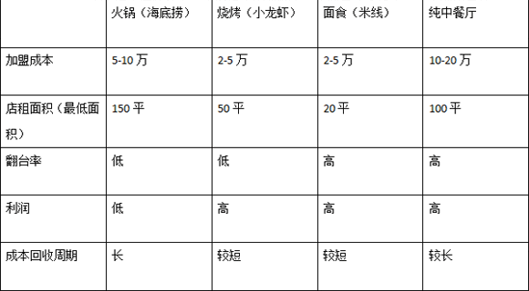 火鍋雖然較為火爆,但市場(chǎng)較飽和,并且初期投資過(guò)于高昂,成本回收周期也長(zhǎng)。中餐與火鍋情況基本相同,但是很看重商鋪地段。燒烤較其他來(lái)說(shuō),優(yōu)勢(shì)很明顯,也是目前市面上火爆的一大熱點(diǎn)項(xiàng)目,缺點(diǎn)在于,翻臺(tái)率低,不符合當(dāng)下社會(huì)快節(jié)奏趨勢(shì)。面食(米線)在目前看來(lái)還是非常有發(fā)展前景的。